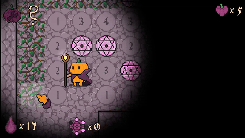 This game was prepared (solo) for the GoedWare Game Jam Halloween Part 2 You are a pumpkin-headed occultist, eager to free forgotten souls in a lost dungeon. Your light slowly fades with time, and you must recharge it by revealing tiles. But be careful: One wrong move, and uninvited guests will crash your ritual. If your light goes out or you run out of lives, your journey ends.